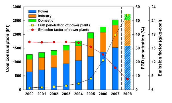 与此同时,中国的二氧化硫排放量是这样的 (Lu et al., 2010):