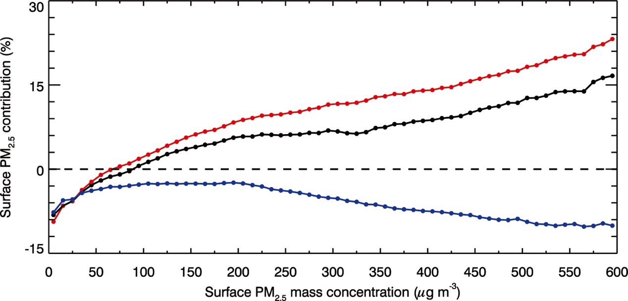 2.  2015125日到201614日,随着近地面PM2.5质量浓度的增加,k豆kdpay钱包-光解相互作用(蓝线)、k豆kdpay钱包-辐射相互作用(红线)以及二者共同作用(黑线)对近地面PM2.5质量浓度的平均百分比贡献的变化趋势